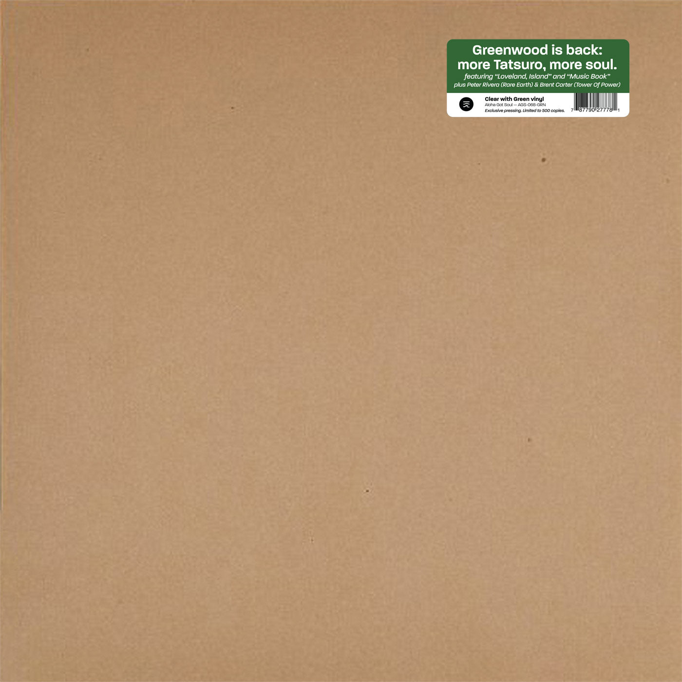 この限定版「アロハ・ゴット・ソウル」には透明で緑のスプラッタービニール、プリントされたインナースリーブ、ハイプステッカー付きの茶色のチップボードジャケット。