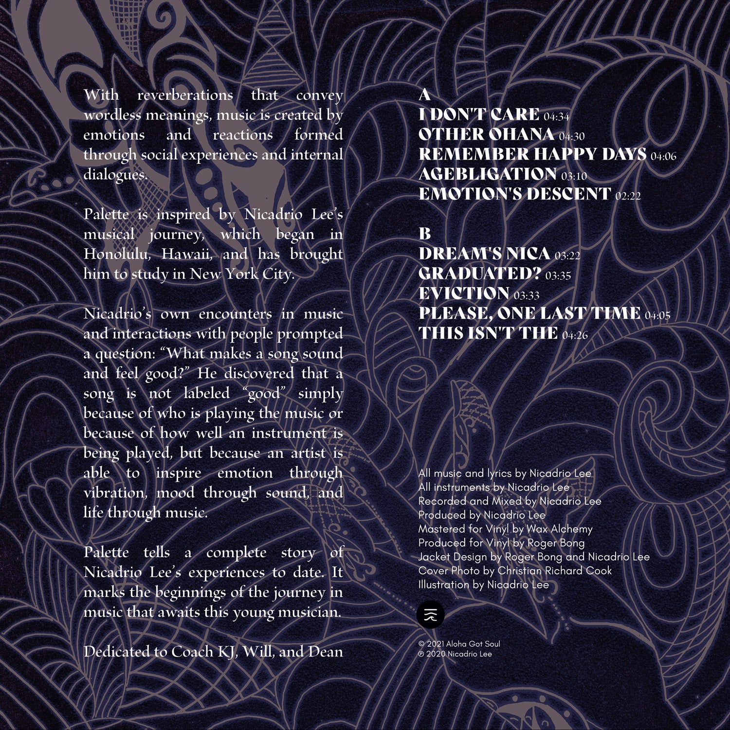 本格的なレコードレーベルとして6年目を迎えたアロハ・ゴット・ソウルは、10代のギタリスト、ニカドリオ・リーと彼のセルフプロデュース作品で新たな領域に進出します。 Palette は、19 歳のギタリストが全面的に録音し演奏したオリジナル曲のベッドルーム シティ ポップ、マス ロック アルバムです。