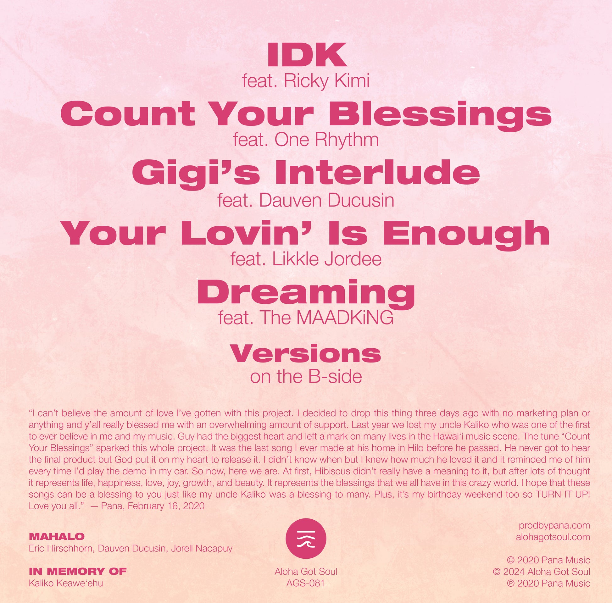 このプロジェクトでこんなにたくさんの愛をもらったなんて、信じられないほどです。3日前、マーケティング計画も何もなく、このプロジェクトを諦めようと決めたのですが、皆さんから本当にたくさんの応援をいただきました。昨年、私と私の音楽を最初に信じてくれた叔父のカリコを亡くしました。ガイは心の広い人で、ハワイの音楽シーンに多くの人々の足跡を残しました。「Count Your Blessings」という曲がこのプロジェクトのきっかけとなりました。彼が亡くなる前に、ヒロの彼の自宅で作った最後の曲でした。彼は完成版を聴くことはありませんでしたが、神様が私の心に「リリースしろ」と告げたのです。いつだったかは分かりませんが、彼がどれほどこの曲を気に入ってくれたかは分かっていました。そして、車の中でデモを聴くたびに、彼のことを思い出しました。